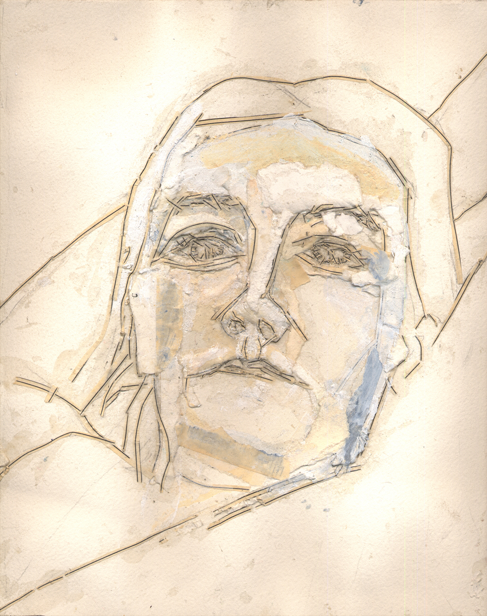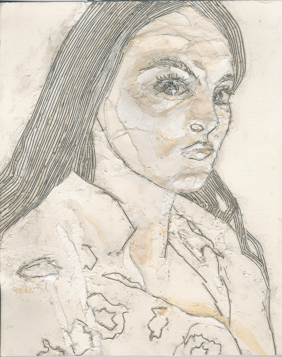 “Elizabeth”, music paper collage with mixed media on paper, 11 x 9 “, 2002
