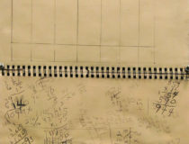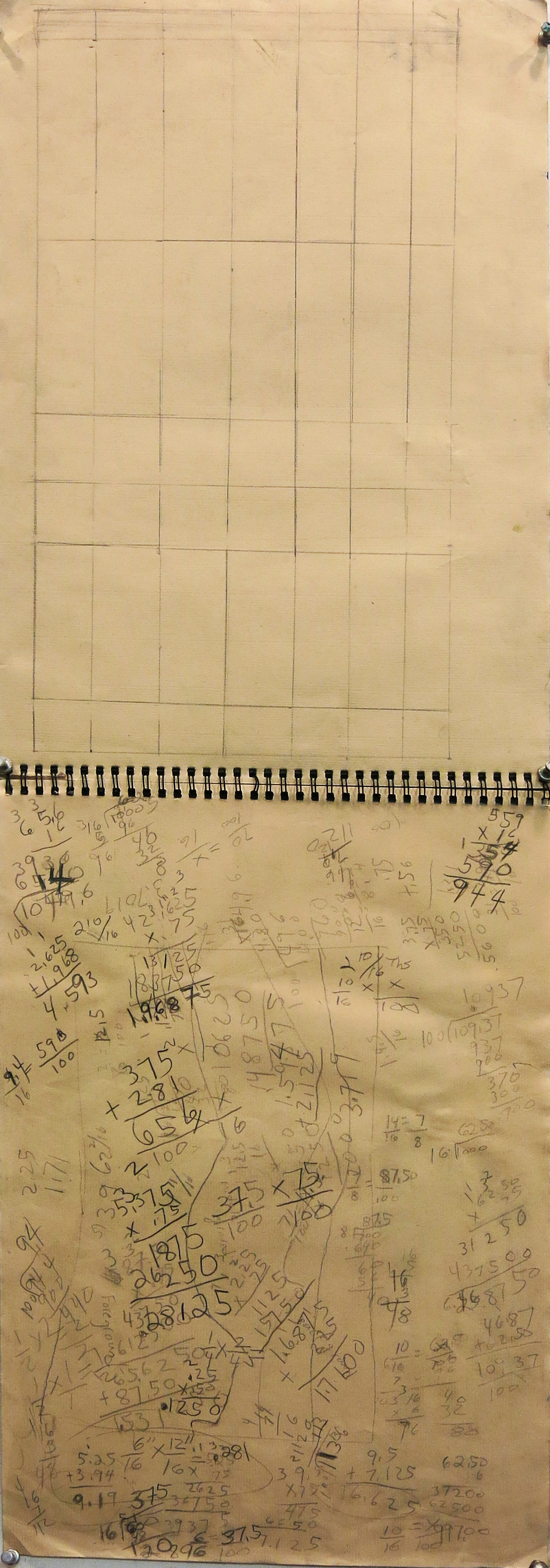 - sketchbook pages with grid and equations to imagine a small piece enlarged: study for “4 Times Square”